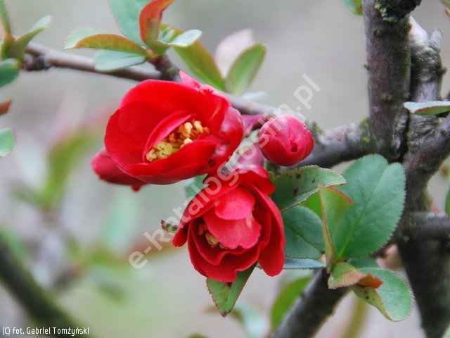 Niski, rozłożysty krzew o mocnych, pokładających się na ziemi pędach. Dorasta do 1,0 m wys. i znacznie większej szer. Pędy pokryte cierniami. Liście ciemnozielone, błyszczące, eliptyczne z ostrym końcem, nieznacznie ząbkowane, z dużymi przylistkami, ustawione naprzemiennie. Kwiaty czerwone z żółtymi pręcikami, pojedyncze, bardzo obfite, rosnące po kilka razem, IV-V. Owoce kuliste, zielone, później żółte, bardzo twarde, nadają się na przetwory. Roślina niewymagająca. stosunkowo wrażliwa na niskie temperatury, jednak dobrze znosząca okresy suszy. Toleruje wiele typów gleby, od kwaśnej do obojętnej, ale preferuje wilgotne. Najlepiej rośnie na glebach żyznych, próchniczych, przewiewnych i ciepłych. Wymaga stanowiska słonecznego. Do sadzenia pojedynczo i w grupach oraz w ogrodach skalnych.
