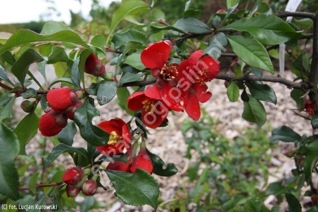 Niski, rozłożysty krzew o mocnych, pokładających się na ziemi pędach. Dorasta do 1,0 m wys. i znacznie większej szer. Pędy pokryte cierniami. Liście ciemnozielone, błyszczące, eliptyczne z ostrym końcem, nieznacznie ząbkowane, z dużymi przylistkami, ustawione naprzemiennie. Kwiaty łososioworóżowe z żółtymi pręcikami, pojedyncze, bardzo obfite, rosnące po kilka razem, IV-V. Owoce kuliste, zielone, później żółte, bardzo twarde, nadają się na przetwory. Roślina niewymagająca. stosunkowo wrażliwa na niskie temperatury, jednak dobrze znosząca okresy suszy. Toleruje wiele typów gleby, od kwaśnej do obojętnej, ale preferuje wilgotne. Najlepiej rośnie na glebach żyznych, próchniczych, przewiewnych i ciepłych. Wymaga stanowiska słonecznego. Do sadzenia pojedynczo i w grupach oraz w ogrodach skalnych.