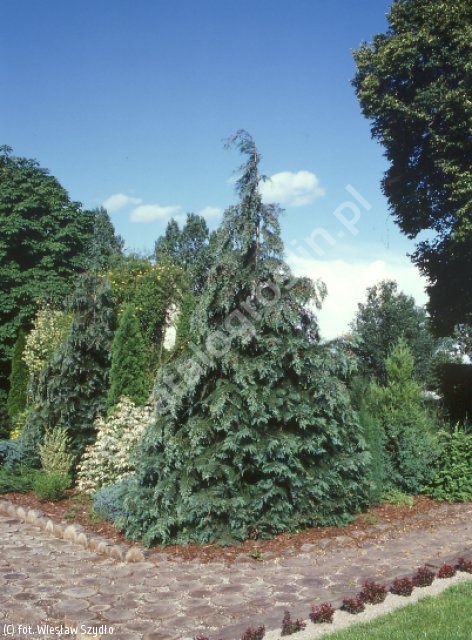 Piękna forma drzewiasta o luźnej, stożkowatej koronie, z przewieszonym na bok wierzchołkiem, osiągająca po 10 latach uprawy 3 m wysokości. Boczne gałęzie mocne, ułożone horyzontalnie, o końcach malowniczo opadających ku ziemi. Gałązki delikatne, rozpostarte, płasko ułożone na pędach, miękkie w dotyku. Łuski małe, ściśle przylegające do gałązek, pokryte woskiem, od góry równomiernie ciemnoniebieskie. Dolna strona gałązek jaśniejsza, niebieskozielona, z wyraźnymi liniami białego nalotu tworzącymi charakterystyczny rysunek. Wiosną na wierzchołkach bocznych odgałęzień pojawiają się drobne kwiaty męskie, zebrane w purpurowe kotki. Wprawdzie nie są widoczne z oddali, ale z bliska bardzo dekoracyjne. Szyszki kuliste, dosyć duże, o średnicy 1 cm, przed dojrzeniem zielone, pokryte sinym, woskowym nalotem, wówczas ozdobne, po dojrzeniu brązowo brunatne, długo utrzymujące się na gałązkach. Wymagania glebowe i wilgotnościowe niewielkie, dobra mrozoodporność. Drzewa polecane do sadzenia w ogrodach przydomowych i parkach, pojedynczo lub w kompozycjach z roślinami iglastymi.