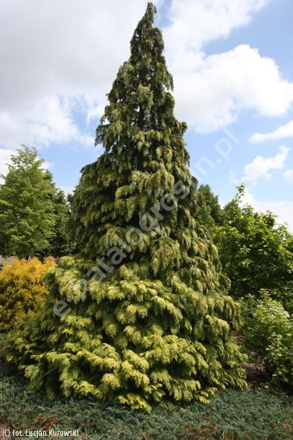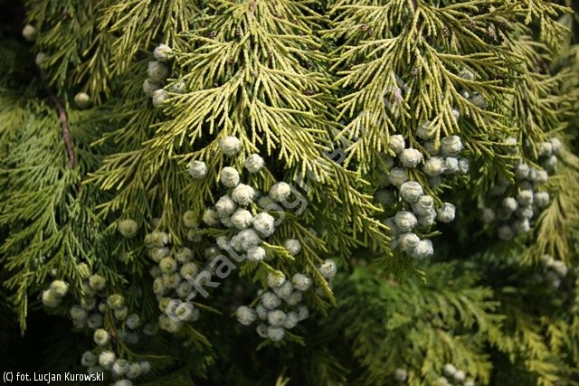 Niewielkie drzewo o pokroju wąskiego stożka i złocistej barwie gałązek, utrzymującej się przez cały rok. Tempo wzrostu wolne, po 10 latach uprawy odmiana osiąga 1,5 m wysokości. Rośliny gęsto ugałęzione. Pędy ustawione horyzontalnie. Wierzchołek silnie przegięty i przewisający. Gałązki drobne, ułożone płasko na pędach, niektóre z nich lekko wzniesione. Jedynie na starych okazach delikatnie opadające, pokryte małymi, ściśle przylegającymi łuskami. Gałązki od góry złocistożółte, część z nich seledynowo lub zielonkawo nakrapiana, od spodu żółtawozielone. Wymagania glebowe i wilgotnościowe umiarkowane. Preferuje gleby żyzne, wilgotne i przepuszczalne. Miejsca słoneczne, ciepłe i osłonięte od wiatru, zwłaszcza w okresie zimy. Odmiana polecana do sadzenia w ogrodach przydomowych i parkach, w różnego rodzaju kompozycjach kolorystycznych z innymi roślinami iglastymi. W pasie nadmorskim i zachodniej części kraju nadaje się do sadzenia w formie szpalerów lub żywopłotów.