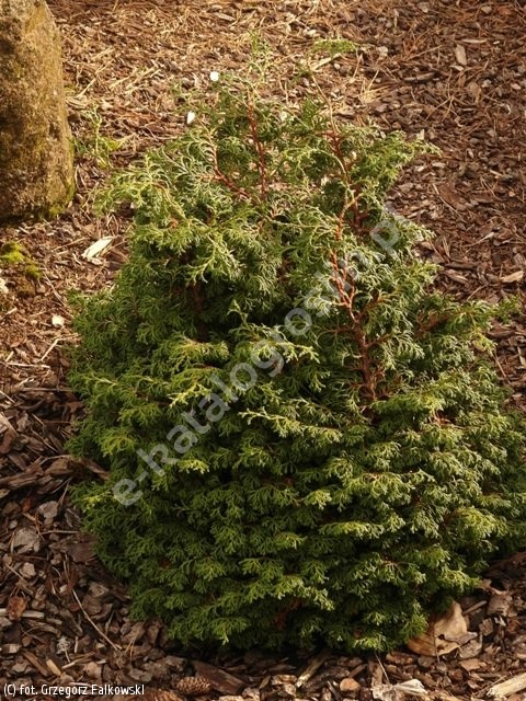 Karłowy krzew o powolnym wzroście i szeroko stożkowatym pokroju. Po 10 latach osiągaja około 0,8 m wysokości i 0,6-0,7 m średnicy (przy ziemi). Pędy bardzo gęste, nitkowate, krótkie, mocno rozgałęzione, lekko zawinięte do dołu. Ulistnienie łuskowate, barwy jasnozielonej. W uprawie krzewy wymagają gleb przeciętnych lub żyznych i próchnicznych, wtedy wzrost silniejszy, umiarkowanie wilgotnych lub wilgotnych. Stanowisko słoneczne lub lekko ocienione, osłonięte zimą przed mroźnymi wiatrami. Odmiana polecana do ogrodów przydomowych, kolekcji karłowych roślin iglastych, zestawień kolorystyczno-pokrojowych, ogrodów japońskich, skalnych, alpinariów, wrzosowisk oraz do uprawy w pojemnikach dla dekoracji patio, balkonów, tarasów.