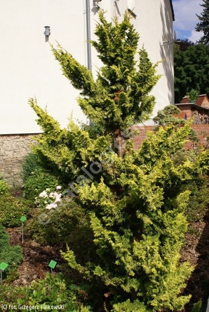 Karłowa, wolnorosnąca odmiana o zwartym pokroju, z gałęziami podniesionymi do góry, dość mocno wyróżniająca się nietypowym pokrojem i rozgałęzieniem pędów. W dolnej części krzewu i pędów rozgałęzienia są krótkie, kędzierzawe, luźniejsze, w wierzchołkowych partiach korony i pędów są bardziej wydłużone i gęsto dwustronnie rozgałęzione. Ulistnienie łuskowate, bardzo atrakcyjne, zabarwione na złocistożółty kolor, dobrze utrzymujący się także w ocienieniu. W uprawie krzewy wymagają gleb przeciętnych lub żyznych i próchnicznych, wtedy wzrost silniejszy, umiarkowanie wilgotnych lub wilgotnych. Stanowisko słoneczne lub lekko ocienione, zimą koniecznie osłonięte przed mroźnymi wiatrami. Odmiana polecana do ogrodów przydomowych, kolekcji roślin iglastych, zestawień kolorystyczno-pokrojowych na rabatach, do ogrodów japońskich, skalnych, alpinariów, wrzosowisk.