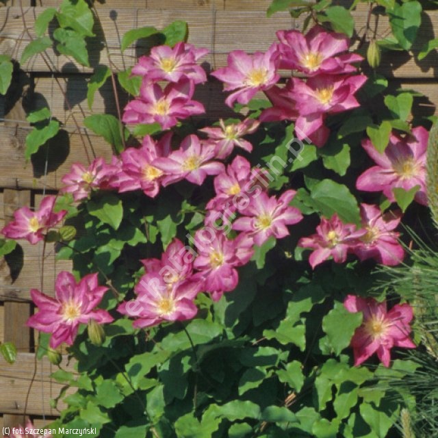 Pięknie kwitnące pnącze o dwubarwnych kwiatach. Owija się wokół podpór za pomocą ogonków liściowych. Rośnie umiarkowanie silnie. Dorasta do 2-3 m wysokości. Kwiaty duże, o działkach kielicha intensywnie różowych, z białą pręgą w środku, najintensywniej zabarwione na brzegach. Pręciki kremowożółte. Kwitnie obficie na pędach zeszłorocznych w V-VI, a następnie słabiej, na pędach tegorocznych, VII-IX. Najlepiej rośnie na glebach żyznych, próchnicznych, wilgotnych, dobrze zdrenowanych, o odczynie od obojętnego do lekko kwaśnego. Nie toleruje gleb podmokłych, zbyt ciężkich, gliniastych lub zbyt lekkich, piaszczystych. Może rosnąć na każdej wystawie, od południowej do północnej, ale w świetle rozproszonym. Nie lubi stanowisk bardzo słonecznych i gorących. Wymaga delikatnego cięcia wczesną wiosną, polegającego na wycinaniu zamarłych lub uszkodzonych pędów. Pozostałe pędy należy w pierwszym roku po posadzeniu przyciąć 30 cm nad ziemią nad silnymi pąkami, w następnym roku 70 cm, a w kolejnych latach 150 cm . W ogrodzie wymaga podpór złożonych z elementów o średnicy do 1 cm. Pięknie się prezentuje na siatkach, kratach, drabinkach i linkachmocowanych do ścian oraz na naturalnych podporach np. krzewach liściastych i iglastych.