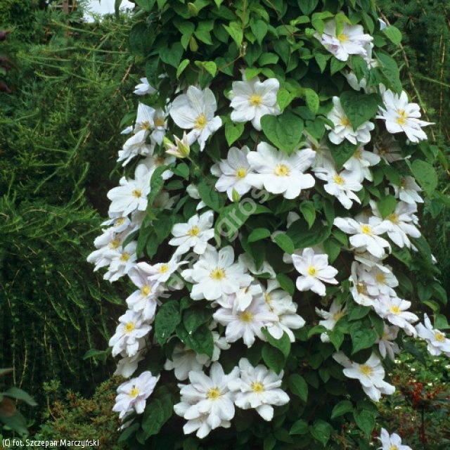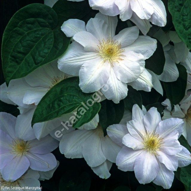 Efektowna odmiana o czystobiałych, dużych kwiatach. Osiąga 3 m. Liście ciemnozielone. Kwiaty płaskie, średnicy 15-20 cm, białe; VI i VIII-IX. Ciąć słabo. Polecana do sadzenia przy niskich podporach lub krzewach.
