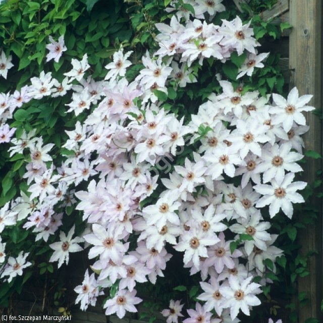 Polska odmiana. Kwiaty średnicy do 20 cm, z 6-8 ostro zakończonymi działkami, o pofalowanych brzegach. Białe, w lecie z delikatnym różowym przebarwieniem. Pręciki duże, ładnie półkoliście ułożone, z purpurowymi pylnikami na jasnoróżowych nitkach. Kwitnie obficie w końcu V – VI i ponownie w końcu VIII - IX. Podpór czepia się ogonkami liściowymi. Lubi miejsca słoneczne. Szczególnie przydatna do uprawy przy altanach, ogrodzeniach, kratach, tyczkach i innych podporach ogrodowych. Może wspinać się po naturalnych podporach.