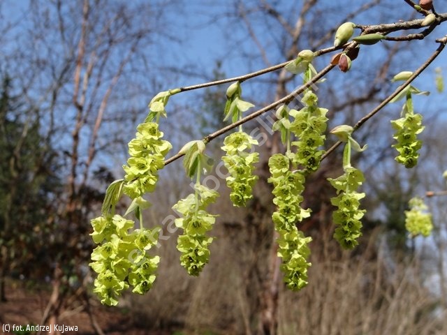 Rzadko spotykany krzew ozdobny pochodzący z Chin. Osiąga wysokość do 2 m i dość szeroko się rozrasta. Liście podobne do liści leszczyny, jajowatego kształtu, dł. 5-15 cm i szer. 4-8 cm, ostro zakończone. Roślinę tą można nazwać zwiastunem wiosny, gdyż jest jednym z najwcześniej kwitnących krzewów. Kwitnie przed rozwojem liści, najczęściej w III-IV, a czasami już w II w sprzyjających warunkach pogodowych. Ładne, zwisające kwiatostany typu kłosy, dł. 5-7 cm, składają się z kilku, kilkunastu drobnych kwiatków, jasnożółtej barwy. Roślina miododajna. Kwiaty wydzielają intensywny aromat, który przyciąga owady szukające pierwszego nektaru. Ma dość duże wymagania. Dobrze rośnie na żyznych, próchnicznych glebach, umiarkowanie wilgotnych. Stanowisko ciepłe i osłonięte od silnych wiatrów, słoneczne lub w półcieniu. Na mróz raczej odporna, ale może przemarzać podczas najbardziej surowych zim. Nadaje się do zachodniej części kraju. Krzew ten, obecnie znajduje się w kręgu zainteresowań kolekcjonerów. Wymaga popularyzacji ze względu na wczesny okres kwitnienia, kiedy większość roślin dopiero oczekuje na rozpoczęcie wegetacji.