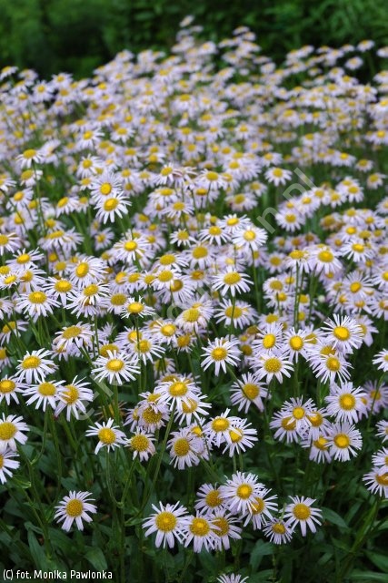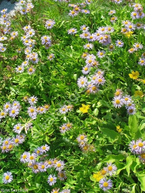 Bylina tworząca kępy zielonych liści, spomiędzy których wyrastają słabo rozgałęzione pędy, wysokości do 50 cm. Pędy bardziej ulistnione, liście łodygowe większe niż u odmian ogrodowych. Na wierzchołkach pędów kilka koszyczków kwiatowych o żółtym środku. W koszyczkach kwiaty języczkowe bardzo liczne, ciemnofioletowe, wąskie; w VI. Często kwitnie powtórnie jesienią. Roślina mało wymagająca, bardzo trwała. Nadaje się do do cięcia. Odpowiednia na rabaty w małych grupach po 3-10. Liczba roślin na 1 m²: 7 - 9.