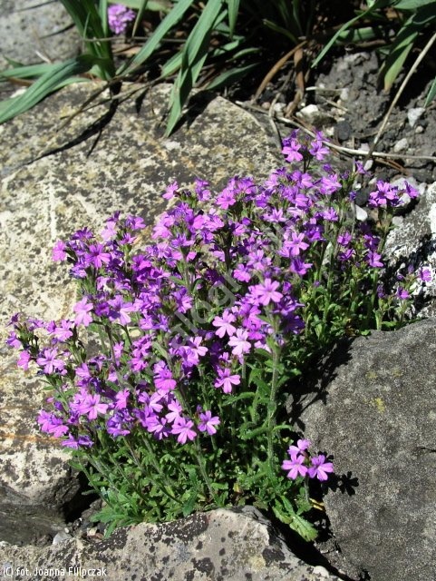 Niska, poduszkowata bylina, o dekoracyjnych kwiatach, dorastająca do 10 cm wysokości. Tworzy przyziemne rozetki. Liście łopatkowatego kształtu, pokryte drobnymi włoskami. Kwiaty drobne, w różnych odcieniach różu lub białe, w groniastych kwiatostanach, osadzone na szczycie wyprostowanej łodygi. Kwitnie w V-VI. Bylina łatwa w uprawie, mało wymagająca. Dobrze rośnie na stanowiskach słonecznych lub półcienistych. Preferuje gleby przepuszczalne, o zasadowym odczynie. Także zimą podłoże powinno być umiarkowanie wilgotne. U tego gatunku najlepszym sposobem rozmnażania jest wysiew nasion. Równie łatwo sam się rozsiewa. Nie jest w pełni mrozoodporny, rośliny zimą należy lekko okryć. Jedna z cenniejszych bylin do ogrodów skalnych i do obsadzania murków kwiatowych. Bardzo ładnie wygląda, gdy wypełnia szczeliny między kamieniami.
