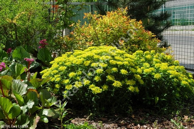 Bylina o bardzo regularnym, półkulistym pokroju, jasnozielonych liściach i żółtych kwiatach, dorastająca do około 0,4 m wysokości. Wczesną wiosną tworzy sztywne i wyprostowane pędy zakończone na przełomie kwietnia i maja złocistymi kwiatostanami w formie baldachów. Kwiaty są bardzo drobne i niepozorne, a funkcję ozdobną przejmują u tego gatunku barwne podkwiatki. Liście wilczomlecza pstrego są zielone, bezogonkowe, o lancetowatym kształcie. Osiągają do 5 cm długości. Do prawidłowego wzrostu bylina ta wymaga dosyć żyznych, gliniastych gleb i słonecznych lub półcienistych stanowisk. Gatunek odporny na mróz, choroby i szkodniki. Po kwitnieniu (w czerwcu) i wczesną wiosną rośliny najlepiej krótko przyciąć. Jest to wartościowa roślina polecana do sadzenia na rabatach bylinowych i w większych ogrodach skalnych, pojedynczo lub w grupach.