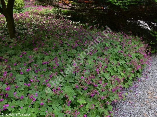 Bujnie rosnąca bylina, tworząca kępy wysokości do 40 cm i szerokości 60 cm. Liście ozdobne przez cały sezon wegetacyjny, jesienią trochę czerwieniejące, aromatyczne. Kwiaty purpuroworóżowe, w V - VI. Do sadzenia w pełnym słońcu lub częściowym cieniu, na przeciętnej, wilgotnej, dobrze zdrenowanej glebie. Nadaje się do ogrodu skalnego, na rabaty, jako wypełnienie między wyższymi roślinami i do zadarniania dużych powierzchni. Polecany do podsadzania drzew i krzewów. Liczba roślin na 1 m2: 8 - 10.