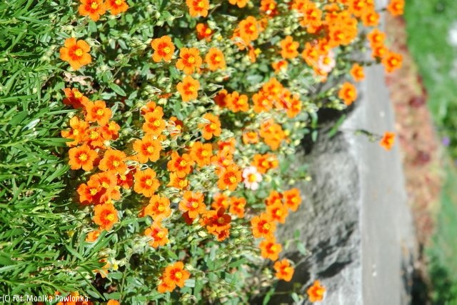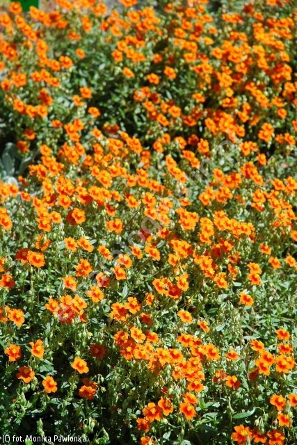 Zimozielona krzewinka wysokości do 30 cm o pokroju płożącym. Liście drobne, ciemnozielone. Kwiaty średnicy do 2,5 cm, brązowopomarańczowe, w luźnych, wzniesionych kwiatostanach. Zakwita w VI. Początkowo kwitnienie jest obfite, później słabnie, ale przeciąga się na dłużej. Znosi suszę. Zaleca się po głównym okresie kwitnienia cięcie odmładzające. Odpowiednia na rabaty, w małych grupach po 3-10 razem. Liczba roślin na 1 m² - 12.
