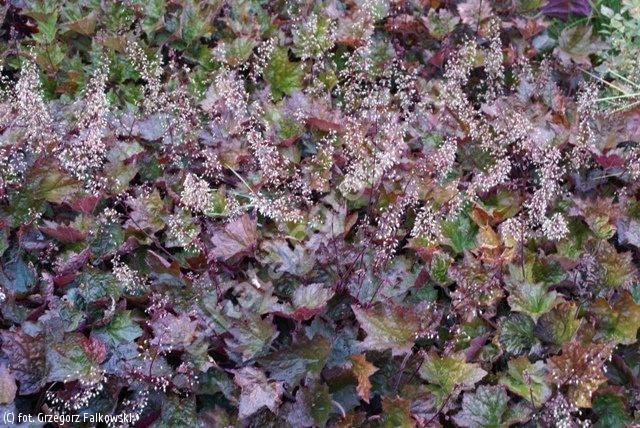 Bylina bujnie rosnąca, tworząca kępy o wysokości 30 cm. Liście ładnego kształtu, sercowate, intensywnie wiśniowoczerwone, dekoracyjne przez długi czas. Smukłe kwiatostany drobnych, beżowych kwiatów, wys. 45 cm, w VI - VII. Wymaga gleby wilgotnej, żyznej, zasobnej w próchnicę. Ciężkie gleby poprawiać dodatkiem torfu. Kwiaty nadają się do cięcia. Do stosowania na rabatach, w większych ogrodach skalnych. Nadaje się też do okrywania większych powierzchni. Do sadzenia w dużych grupach po 10-20 razem. Liczba roślin na 1 m2 - 12.