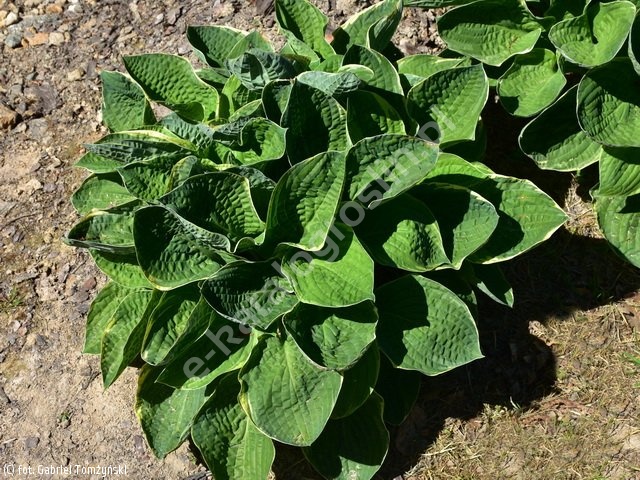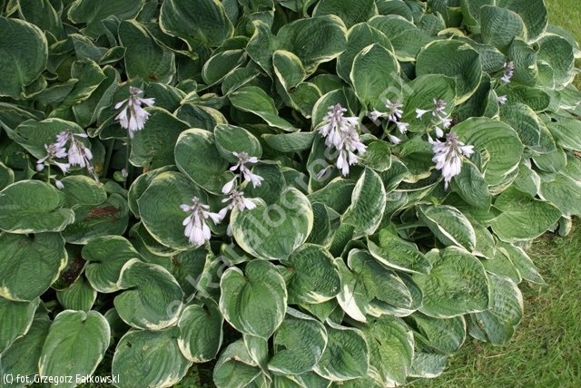 Bujnie rosnąca bylina, o dużych, sercowatych liściach. Tworzy kępę o średnicy 70 cm. Liście zielone, głęboko pofalowane, z kremowobiałym, nieregularnym marginesem. Kwiaty lejkowate, białe w luźnych kwiatostanach, VII. Wymaga gleby bardzo żyznej, próchnicznej, stale wilgotnej. Nadaje się na rabaty, do okrywania większych powierzchni w cieniu. Ładniej wygląda sadzona pojedynczo lub w niewielkich grupach, po 2-3 lub po 3-10 razem. Liczba roślin na 1 m² - 5.