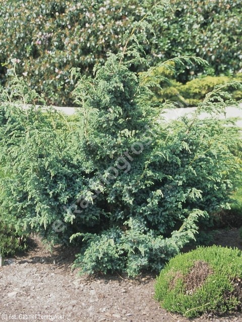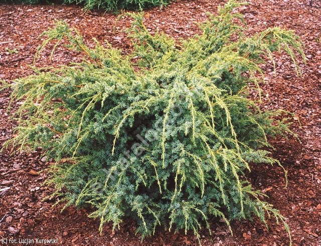 Silnie rosnący krzew o wzniesionym, rozłożystym pokroju i niebieskozielonym ulistnieniu. Po 10 latach uprawy dorasta do 2 m wysokości i podobnej średnicy. Pędy wyprostowane, wznoszące się pod ostrym kątem, na końcach malowniczo, łukowato zwieszone. Młode pędy żółte, starsze czerwonobrązowe. Gałązki dosyć drobne, okryte igłami ułożonymi po 2-3 w okółkach. Ulistnienie srebrzystoniebieskie. Igły ostro zakończone, kłujące, od góry z wyraźnym, niebieskim nalotem, do 1 cm długości. Klon męski - nie zawiązuje szyszkojagód. Roślina o skromnych wymaganiach uprawowych, polecana do sadzenia na glebach lekkich, przepuszczalnych, a nawet suchych i niezbyt zasobnych w składniki pokarmowe. Tworzy płytki system korzeniowy, co powoduje że źle znosi przesadzanie. Dlatego do sadzenia należy wybierać rośliny uprawiane w pojemnikach lub z bryłą korzeniową. Wymaga stanowisk w pełni nasłonecznionych. Odmiana odporna na mróz, dosyć dobrze znosi przycinanie. Polecana do uprawy jako roślina soliterowa, sadzona w miejscach wyeksponowanych w dużych ogrodach i parkach. Nadaje się także do stosowania w zieleni osiedlowej.