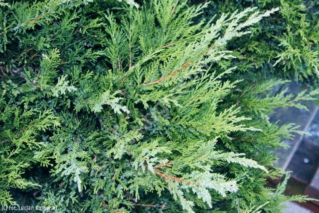 Krzaczasta, silnie rosnąca odmiana jałowca o nieregularnym ułożeniu pędów, osiągająca po 10 latach uprawy około 1 m wysokości i 2 m szerokości. Rocznie przyrasta o 20 cm. Pędy wyrastają w różnych kierunkach, początkowo są lekko uniesione i szeroko rozpostarte, z wiekiem krzew się wypiętrza. Gałęzie są sztywne i dosyć grube. Ulistnienie w postaci łusek oraz krótkich igieł, z wierzchu zielonych, od spodu pokrytych srebrzystym nalotem. Wymagania glebowe i wilgotnościowe małe. Dobrze rośnie na wszystkich przepuszczalnych glebach ogrodowych. Odporny na suszę i mróz. Wymaga pełnego nasłonecznienia. Dobrze znosi przycinanie. Odmiana polecana do sadzenia w grupach w parkach i ogrodach. Może pełnić rolę rośliny okrywowej, do umacniania skarp i nasypów. W uprawie od końca XIX wieku.