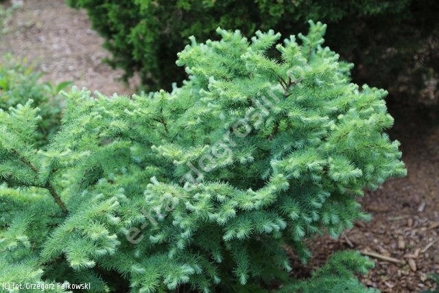 Karłowy, zwarty krzew o płaskokulistym kształcie. Osiąga po 10 latach ok. 1 m średnicy. Nie wytwarza pędu przewodniego. Młode pędy czerwonawobrunatne. Igły sezonowe, niebieskozielone, 3-4 cm długie, bardzo gęsto pokrywające pędy, wcześnie pojawiające się wiosną. Przed jesiennym opadnięciem przebarwiają się na intensywny, żółty kolor. Zwykle oferowany w postaci małego drzewka, szczepionego na niewysokiej podkładce. Ten miniaturowy modrzew nie ma specjalnych wymagań, choć lepiej rośnie na glebach żyźniejszych, umiarkowanie wilgotnych, w pełnym słońcu. Dobrze prezentuje się w małych ogrodach, nad brzegiem zbiornika, na wrzosowisku i w ogrodzie skalnym. Podobną odmianą jest ‘Wolterdingen’.