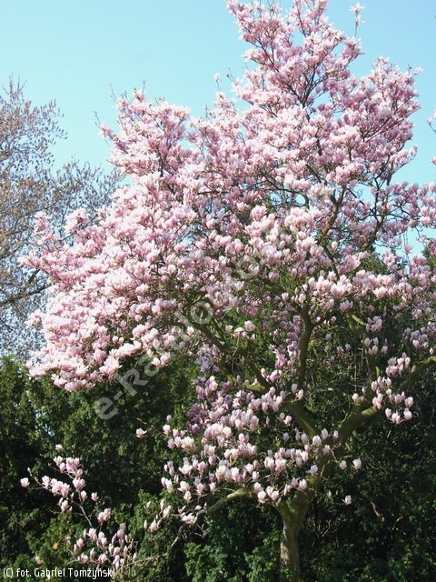 Krzew lub niewysokie drzewo o nisko osadzonej koronie. Osiąga wys. 5-6 m. Kwitnie wraz z rozwojem liści, na przełomie IV/V. Kwiaty duże, kielichowate, białe, u nasady i na zewnątrz zaróżowione, w pełni kwitnienia szeroko rozwarte, pachnące. Wymaga gleb żyznych, próchnicznych, dostatecznie wilgotnych, lekko kwaśnych. Stanowiska słoneczne i osłonięte.
