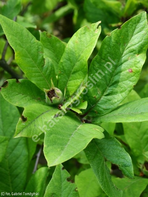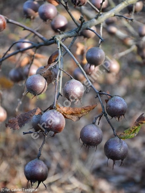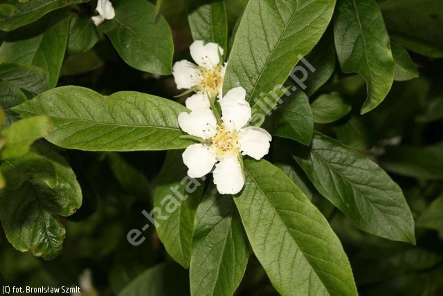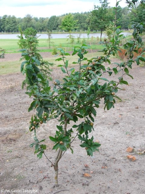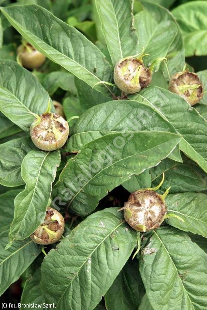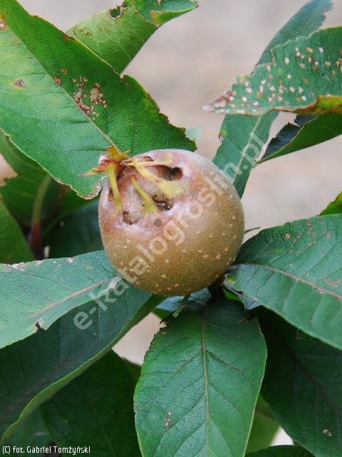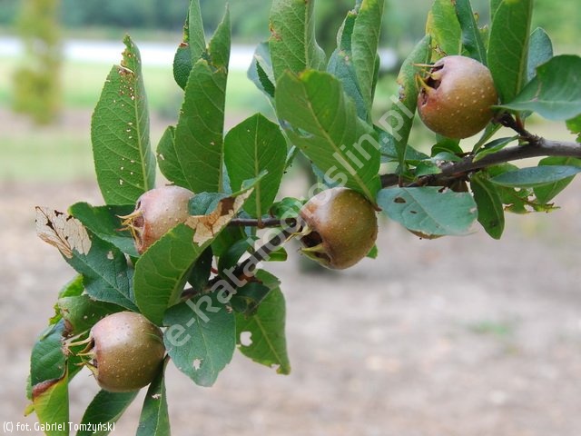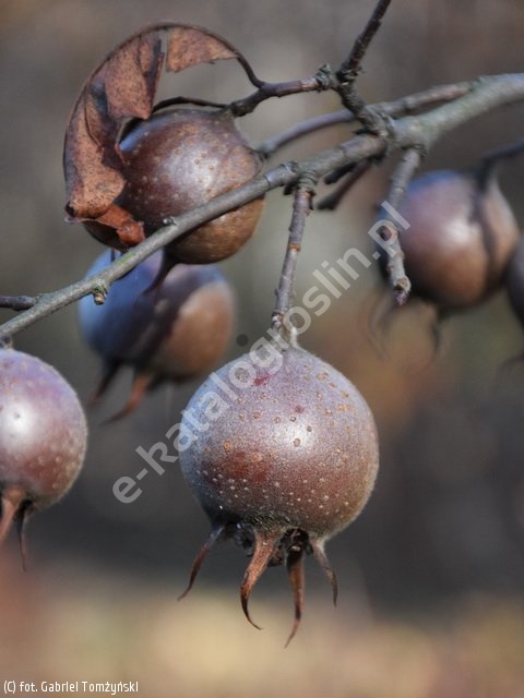Małe drzewo o krótkim, często krzywym pniu i o jadalnych owocach. Często rośnie w formie krzewiastej. Pokrój szeroki, rozłożysty, gęsty. Wzrost powolny, dorasta do 3-5 m wys. i podobnej szer. Pochodzi z Azji Mniejszej, zostało rozpowszechnione przez starożytnych Rzymian w całym cesarstwie. Pędy cierniste. Liście jasnozielone, lancetowate, 7-12 cm dł. Kwiaty 5-płatkowe, duże, białe, VI. Owoce kuliste, do 4 cm śr., mają gruszkowaty kształt oraz długie zaschnięte działki kielicha. Świeże owoce są twarde i cierpkie, do jedzenia nadają się po pierwszych przymrozkach lub po okresie przechowywania, kiedy miąższ zmieni barwę z białej na brązową i stanie się miękki i słodki. Można je jeść na surowo, po ugotowaniu lub w przetworach. Roślina wymaga żyznej gleby i słonecznego stanowiska. Podczas surowych zim może przemarzać. Gatunek amatorski do ogrodów przydomowych.