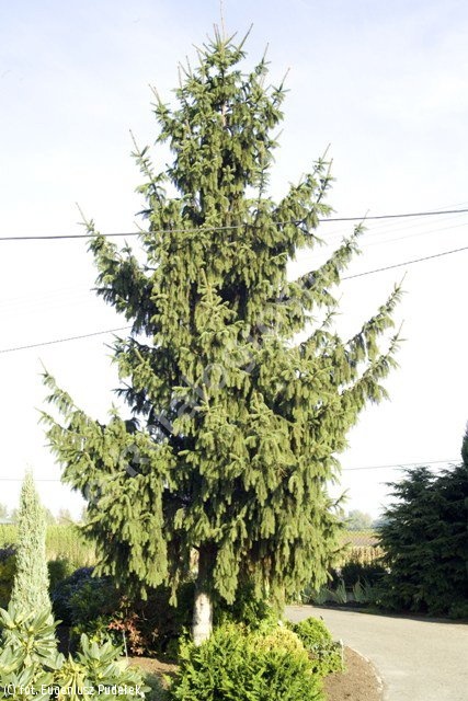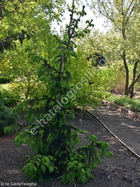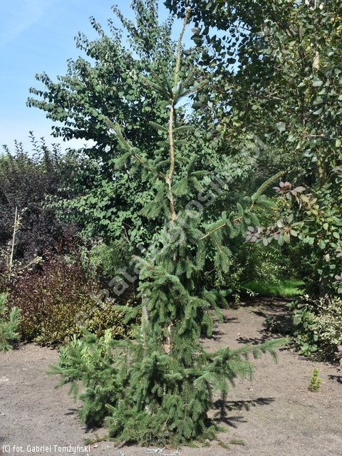 Stara odmiana wyselekcjonowana w XIX w. Wzrost taki, jak typowego świerka pospolitego Picea abies. Dorasta do wysokości 8-10 m i średnicy korony 3-5 m. Pokrój stożkowy, luźny, z wyraźnie zaznaczonym, prostym pniem. Dolne konary szeroko rozpostarte i obwisające. Boczne pędy drugiego rzędu malowniczo zwisające. Igły długie, 2-5 cm długości, żywozielone, charakterystyczne dla odmiany, dłuższe niż typowe i zakrzywione w kierunku pączka szczytowego. Duże wymagania siedliskowe, szczególnie w stosunku do wilgotności i czystości powietrza. Najlepiej rośnie na glebach gliniasto-piaszczystych, próchnicznych, o umiarkowanej wilgotności, lekko kwaśnych; na stanowiskach nasłonecznionych lub lekko zacienionych. Bardzo ładna odmiana przypominająca świerki rosnące w górach i uformowane przez duże opady śniegu. Do sadzenia w parkach i większych ogrodach.