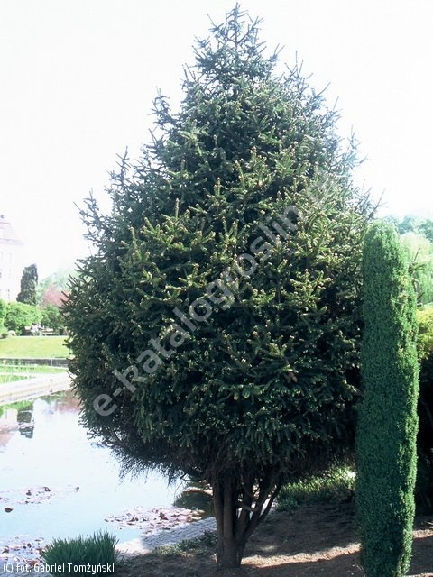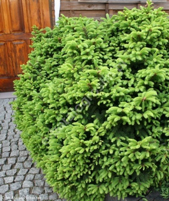 Karłowa, zwarta odmiana świerka. Pokrój początkowo kulisty, krzaczasty, później rośliny wytwarzają przewodnik i przyjmują formę zaokrąglonego stożka. Korona bardzo gęsta i zwarta. Stare kilkudziesięcioletnie okazy dorastają po wielu latach nawet do 6 m wysokości i 2-4 m szerokości. Rośnie bardzo powoli. Pędy przyrastają rocznie około 5 cm. Pędy gęsto ułożone, sztywne, tworzą charakterystyczne „wachlarzyki”. Igły krótkie, 4-12 mm długości, jasne, żywozielone. Szyszek nie wytwarza. Małe wymagania siedliskowe. Najlepiej rośnie na glebach gliniasto-piaszczystych, próchnicznych, o umiarkowanej wilgotności, lekko kwaśnych. Wrażliwa na suche powietrze i zanieczyszczenia przemysłowe. Wymaga stanowisk nasłonecznionych lub lekko zacienionych. Do sadzenia w ogrodach skalnych, wrzosowiskowych i na rabatach w zestawieniach z innymi karłowymi iglakami.