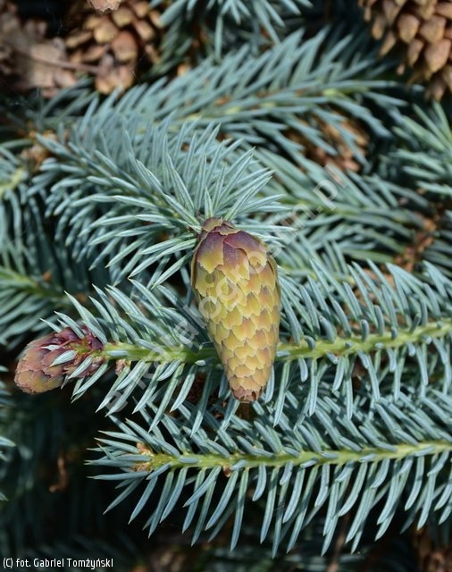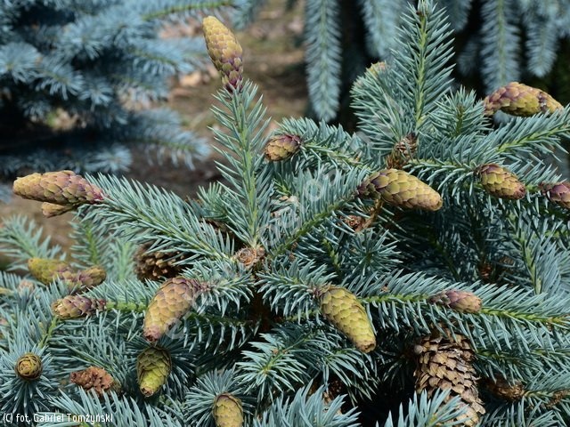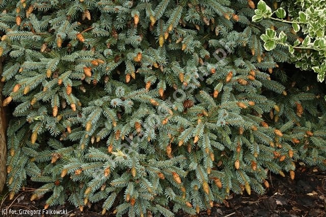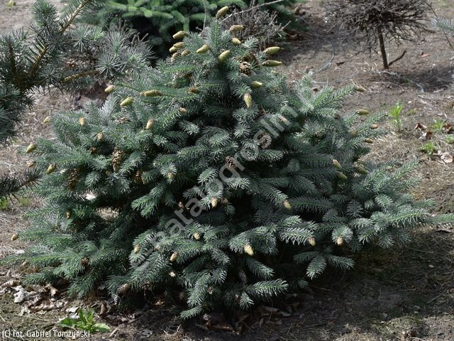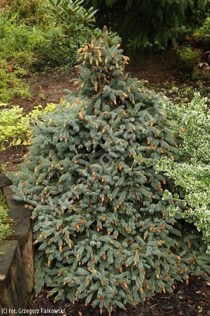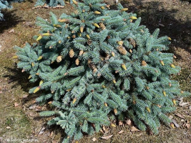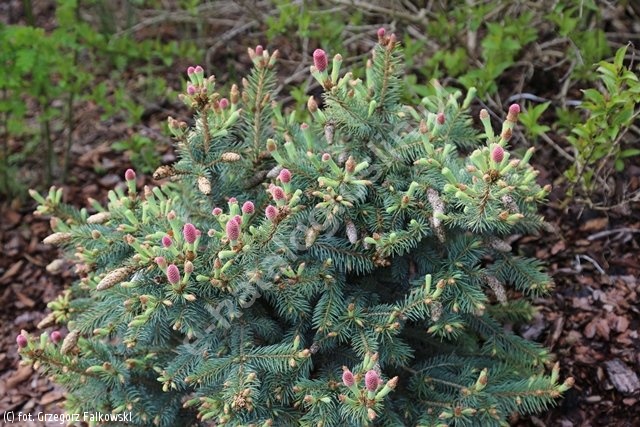 Karłowy, gęsty świerk o krzaczastym, zaokrąglonym pokroju i oryginalnie osadzonych szyszkach. Wzrost powolny. Po dziesięciu latach osiąga średnicę 0,5-0,7 m. Starsze rośliny wypiętrzają się przyjmując kształt szerokiego stożka. Pędy bardzo gęste, sztywne, poziomo rozpostarte. Igły krótkie, kłujące, ułożone na pędzie promieniście, szaroniebieskie. Rośliny już w młodości zawiązują bardzo liczne, osadzone na końcach pędów szyszki. Młode, wiosenne szyszki aramantowoczerwone, dojrzałe stają się jasnobrązowe. Roślina bardzo odporna, całkowicie mrozoodporna, o małych wymaganiach glebowych. Dobrze rośnie na wszystkich uprawnych, ogrodowych glebach, najlepiej na żyznych, wilgotnych, przepuszczalnych, kwaśnych lub lekko kwaśnych. Wymaga stanowiska słonecznego. Odmiana zaliczana do ciekawostek ogrodowych. Do sadzenia pojedynczo na rabatach, w ogrodach skalnych, wrzosowiskowych i do pojemników. Rozmnażana przez szczepienie. Czasami oferowana w handlu w formie miniaturowego drzewka, szczepiona na niewysokim pniu.