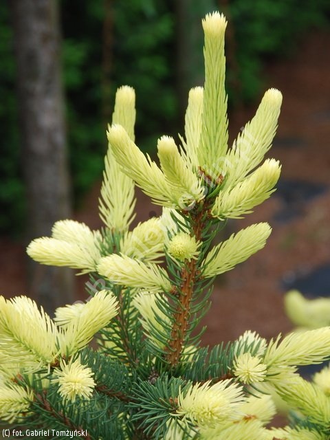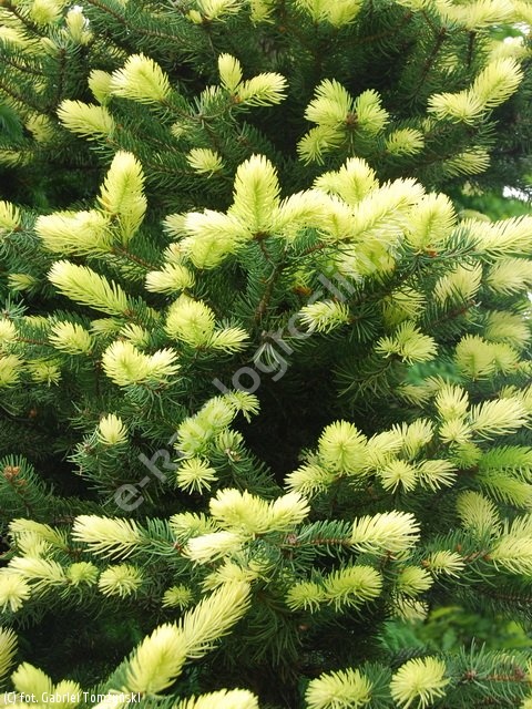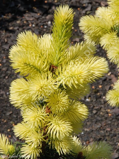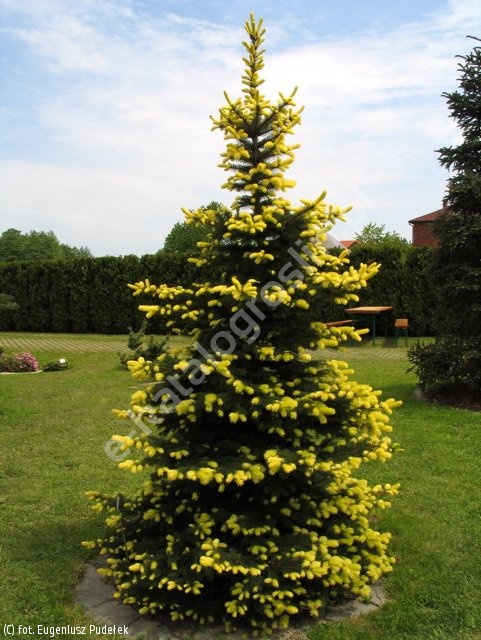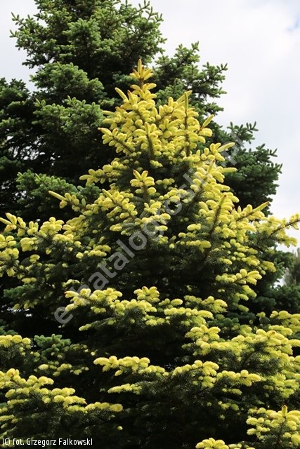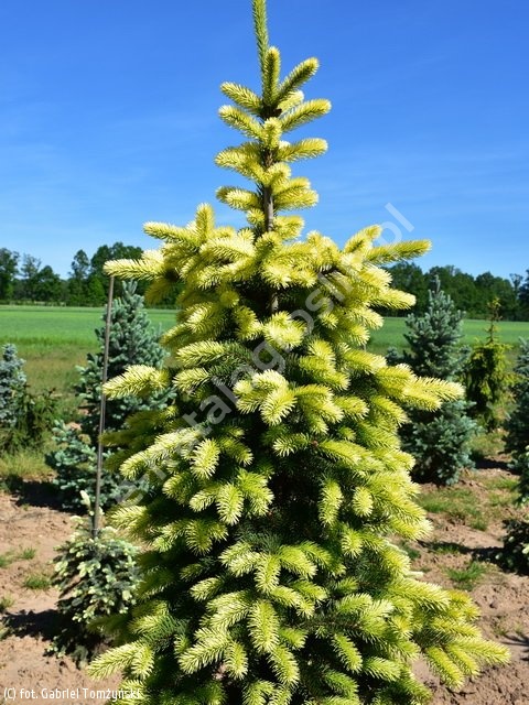 Odmiana świerka kłującego o oryginalnym wiosennym zabarwieniu. Pokrój szerokostożkowy, często nieregularny. Wzrost średnio silny. W wieku 10 lat osiąga 3 m wysokości i 1,5 m średnicy. Pędy sztywne, krótkie, ułożone poziomo. Igły grube, długości do 3 cm, sztywne, czworokanciaste, bardzo kłujące, ułożone na pędach promieniście, zielonoszare. Młode wiosenne przyrosty wspaniale złocistożółte. Kontrastujące końcówki pędów po kilku tygodniach bledną, przybierając barwę zieloną z szarym odcieniem. Szyszek nie zawiązuje. Odmiana wytrzymała na mrozy, mało wymagająca. Dobrze rośnie na wszystkich uprawnych, ogrodowych glebach, najlepiej na żyznych, wilgotnych, przepuszczalnych, kwaśnych lub lekko kwaśnych. Wymaga stanowisk słonecznych. Nadaje się do większych ogrodów przydomowych, do sadzenia pojedynczo. Wiosną jedna z najładniejszych odmian, w pozostałym okresie nie rzucająca się w oczy. Odmiana rozmnażana przez szczepienie.