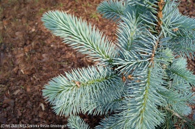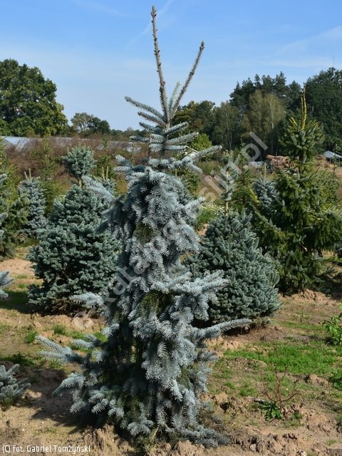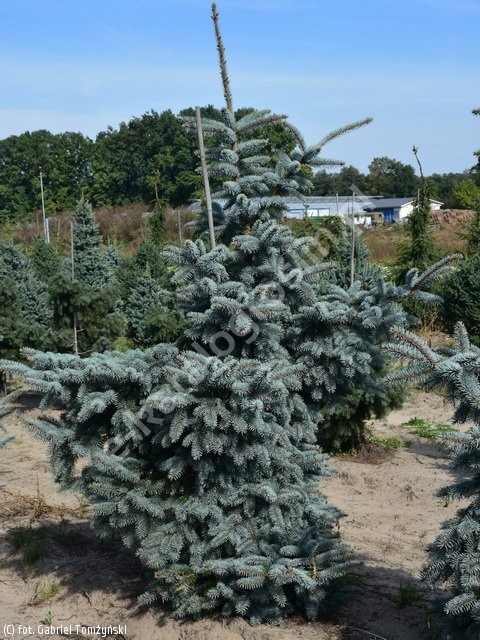 Drzewo o silnym wzroście i atrakcyjnym srebrzystym wybarwieniu, trwałym przez cały rok. Od innych podobnych odmian wyróżnia się wąskostożkowatym pokrojem, gęstymi, krótkimi konarami i długim pędem wierzchołkowym. Pokrój początkowo nieregularny. Stosunkowo trudno wyprowadza przewodnik. Wzrost nieco wolniejszy niż świerków tego gatunku rozmnażanych z siewu. Po 10 latach osiąga do 2-3 m, po wielu latach dorasta do 10–15 m wysokości. Igły kłujące, długości do 3 cm, czterokanciaste, niebieskobiałe po obu stronach, pięknie wybarwione, ułożone promieniście na pędach. Roślina o małych wymaganiach glebowych, odporna na niskie temperatury i suszę. Dobrze rośnie na wszystkich uprawnych, ogrodowych glebach, najlepiej na żyznych, wilgotnych, przepuszczalnych, kwaśnych lub lekko kwaśnych. Do sadzenia w miejscach słonecznych. Nadaje się do dużych ogrodów i parków. Najładniej wyglądają rośliny posadzone pojedynczo na dużej przestrzeni. Odmiana rozmnażana przez szczepienie. Młode szczepione rośliny wymagają palikowania do momentu wytworzenia regularnego pokroju.