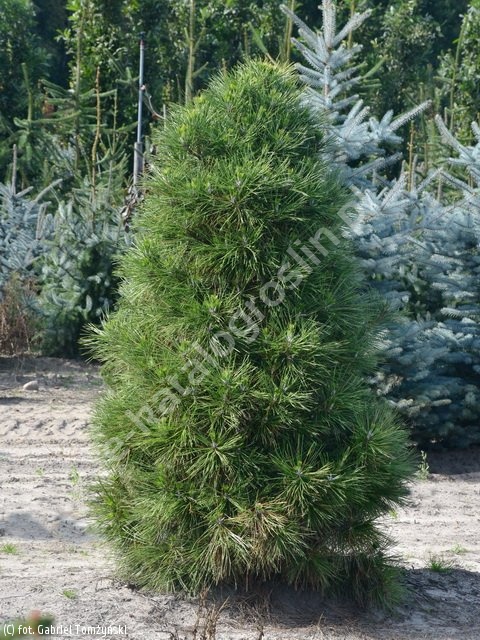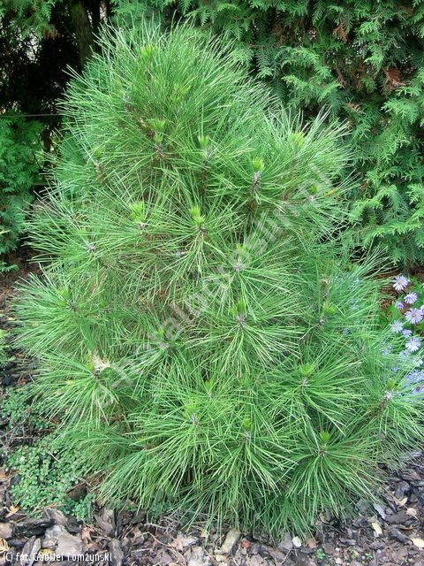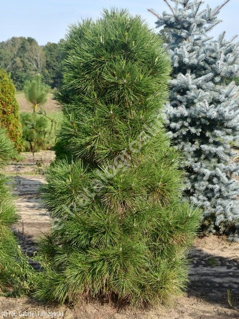 Wolnorosnąca odmiana sosny czarnej o regularnym, kulistym pokroju. Korona bardzo gęsta, z czasem staje się jajowata i nieco luźniejsza. Roczny przyrost 10-15 cm. Po 10 latach osiąga 1-1,5 m średnicy. Pędy sztywne, wyprostowane. Igły ciemnozielone, zebrane po dwie, z pierwszego przyrostu bardzo długie, 10-15 cm, sztywne, dość luźno ułożone. W drugiej połowie lata pojawiają się drugie przyrosty z krótkimi igłami, które tworzą dekoracyjne rozetki na końcach pędów. Roślina odporna na niskie temperatury i suszę, o małych wymaganiach glebowych. Najlepiej rośnie na glebach zasadowych lub obojętnych, zarówno suchych piaszczystych jak i gliniastych. Wymaga stanowiska słonecznego. Polecana do ogrodów przydomowych. W kompozycjach roślinnych mocna, kulista forma o ciemnym kolorze. Należy sadzić pojedynczo, na rabatach i w ogrodach skalnych.