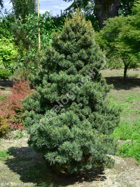 Atrakcyjna, karłowa sosna o zwartym, regularnym, kulistym pokroju. Z wiekiem przybiera kształt bardziej spłaszczony. Po 10 latach osiąga 0,5-0,7 m wys. Dorasta do 1,5 m śr. Igły miękkie, krótkie, 2,5-4 cm dł., matowe, młode srebrnoniebieskie, później niebieskoszare, zebrane po 5. Młode przyrosty jasnozielone. Wymaga stanowiska słonecznego i umiarkowanie wilgotnego, dobrze drenowanego podłoża. Wrażliwa na suszę. Do sadzenia w ogrodach skalnych, wrzosowiskowych i do pojemników. Świetna do formowania dla miłośników sztuki bonsai.
