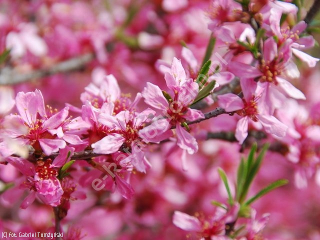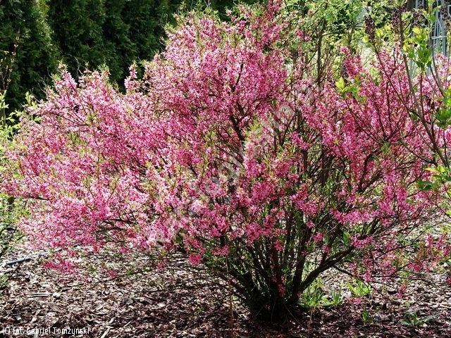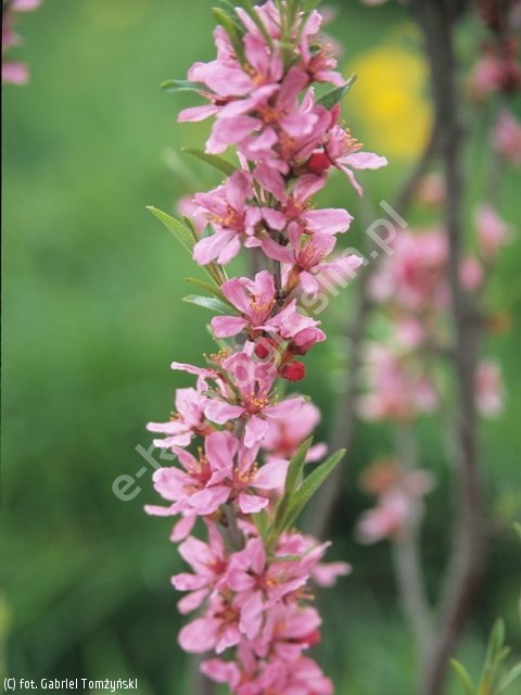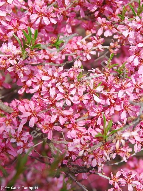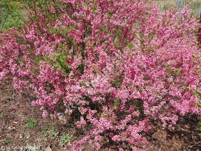 Ekspansywny, niski, gęsty krzew, pięknie kwitnący wczesną wiosną. Pochodzi z Europy południowo-wschodniej. Pokrój płaskokulisty. Dorasta do 1-1,5 m wys. Daje odrosty korzeniowe. Liście lancetowate 3-7 cm dł., błyszczące, jesienią przebarwiają się na pomarańczowo. Kwitnie bardzo obficie wczesną wiosną, przed rozwojem liści, IV-V. Kwiaty jasnoróżowe na krótkich szypułkach, 2-3 cm śr., pachnące, obcopylne. Owoce żółtawe, 2 cm dł., gęsto owłosione, w lipcu po dojrzeniu pękają. Tolerancyjny, co do gleby, nadaje się na stanowiska słoneczne. Zalecane cięcie po kwitnieniu. Wrażliwy na moniliozę. Nie może być sadzony w glebie zadarnionej i nie odchwaszczanej. Szczepiony na ałyczy nie daje odrostów korzeniowych. Do małych ogrodów, na skarpy i do ogrodów skalnych.