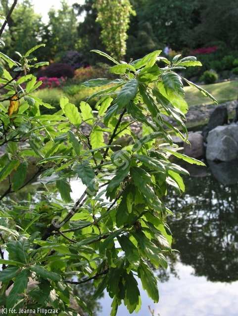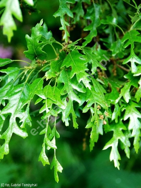 Wysokie drzewo o pokroju początkowo stożkowatym, a później rozłożystym. Rośnie szybko. Dorasta do 30 m wysokości. W naszym klimacie zwykle niższe, do 20 m. Kora ciemna i gruba. Pączki charakterystyczne, otoczone długimi frędzlami. Liście o zmiennym kształcie, długości 6-12 cm, grubo ząbkowane, skórzaste, pofalowane, z wierzchu ciemnozielone, błyszczące, od spodu szarozielone. Jesienią przebarwiają się na żółtobrązowo, czasem na czerwono, wiszą długo, często do wiosny. Kwiaty męskie to żółto-zielone kotki, pojawiające się w kwietniu, maju. Żołędzie brązowe o długości do 3 cm, otoczone frędzelkowatymi miseczkami. Gatunek głęboko korzeniący się, odporny na suszę i wysoką zawartość wapnia w glebie. Dobrze znosi upały, suche powietrze i silny wiatr. Tolerancyjny co do gleby. W młodym wieku może lekko podmarzać. Polecany do sadzenia w parkach, jako drzewo alejowe, do tworzenia osłon wiatrowych, na słabe gleby.