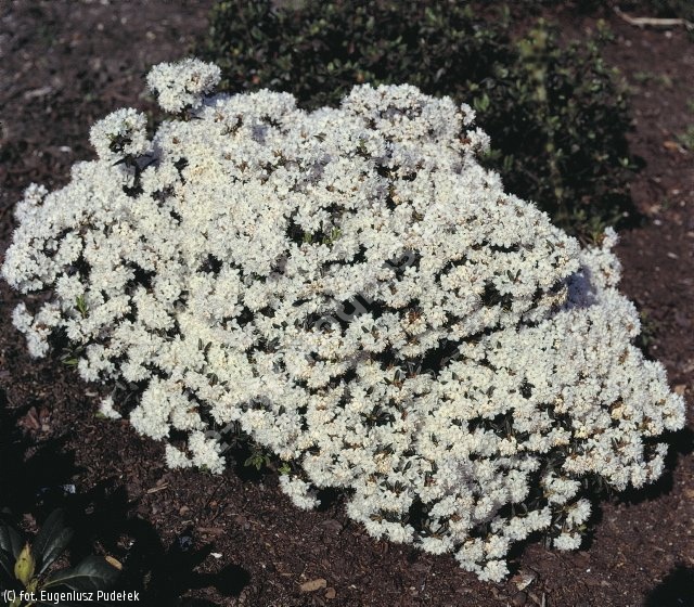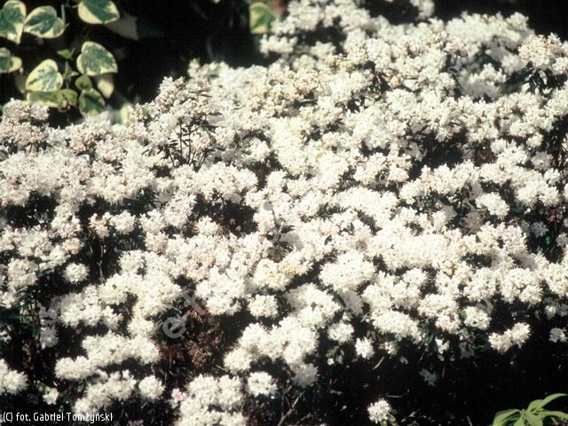 Zimozielony, karłowy krzew o kulistym pokroju. Po 10 latach dorasta do około 0,5 m średnicy. Liście soczyście zielone, bardzo gęste, drobne. Kwiaty białe, bardzo małe, około 1 cm średnicy, ale bardzo liczne. Kwitnie bardzo obficie na początku maja. Wymaga stanowisk półcienistych oraz gleb kwaśnych, wilgotnych i próchnicznych. Może również rosnąć w pełnym słońcu, w ogrodach skalnych i na wrzosowiskach, w towarzystwie innych krzewów wrzosowatych. Odmiana odporna na mrozy. Niekiedy późne przymrozki mogą uszkodzić część kwiatów.