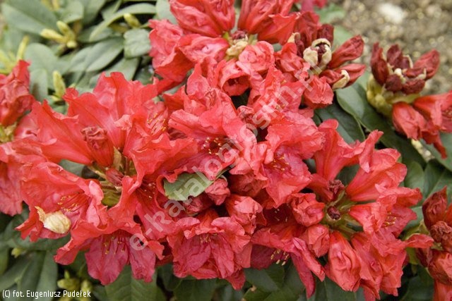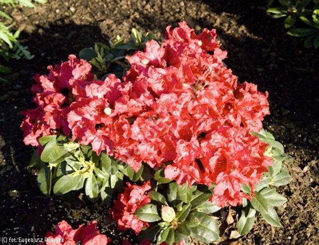 Wolno rosnący krzew o zwartym pokroju. Po 10 latach osiąga zaledwie 0,7 m wysokości i 1,2 m szerokości. Kwitnie bardzo obficie, około połowy maja. Kwiaty intensywnie czerwone z pofalowanymi płatkami. Liście błyszczące, ciemnozielone. Wymaga gleby próchnicznej, kwaśnej. Preferuje stanowisko półcieniste. Roślina polecana do ogródków przydomowych oraz ogrodów wrzosowiskowych. Mrozoodporność do -22 C.
