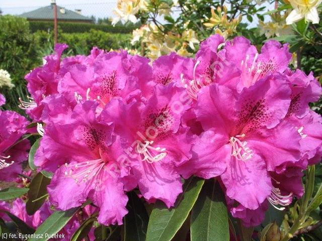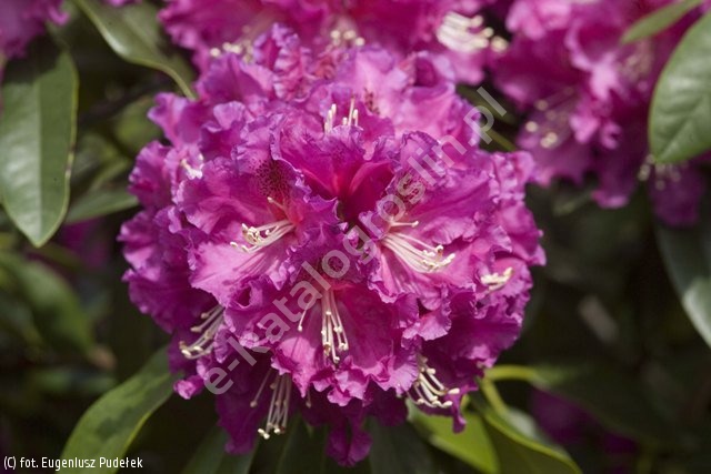 Krzew o pokroju zwartym i płaskokulistym. Po 10 latach dorasta do ok.1,3 m wysokości i ok.1,5 m szerokości. Liście lancetowate, ciemnozielone, lekko błyszczące. Kwiaty purpurowoliliowe do purpuroworubinowego, o jaśniejszym i pofalowanym brzegu płatków, z brązowoczerwoną plamką wewnątrz kielicha i wyraźnymi, białymi pręcikami. Średnica pojedynczego kwiatu 7-8 cm. Kwiaty zebrane są po 14-16 sztuk w dużych, 13 cm wysokich i 16 cm szerokich, wierzchołkowych kwiatostanach. Kwitnie bardzo obficie w drugiej połowie maja. Wymaga stanowisk półcienistych i zacisznych oraz gleb kwaśnych, próchnicznych i umiarkowanie wilgotnych. Mrozoodporność do -22 st.C, dlatego wymaga dobrego, zimowego okrycia.