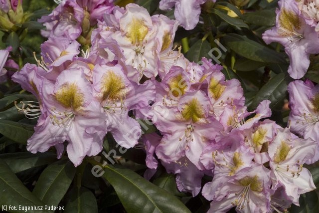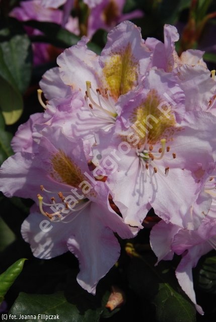 Zimozielony krzew o pokroju kompaktowym i umiarkowanej sile wzrostu. Po 10 latach dorasta do około 1,2 m wysokości i 1,6 m szerokości. Liście ciemnozielone, eliptyczne, na brzegu lekko podwinięte. Kwiaty jasnofioletowe, z dużą oliwkowozieloną plamą na górnym płatku, duże, 8-9 cm średnicy, zebrane są po 12-14 sztuk w efektownych, prawie okrągłych, wierzchołkowych kwiatostanach. Kwitnie dość długo, od połowy maja do końca pierwszej dekady czerwca. Wymaga stanowisk półcienistych oraz gleb kwaśnych, próchnicznych i umiarkowanie wilgotnych. Mrozoodporność do - 22 st. C. Jest to efektowna i piękna odmiana, polecana do ogródków przydomowych, na wrzosowiska oraz do sadzenia na rabatach pojedynczo i w grupach.