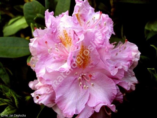 Zimozielony, zwarty krzew o pokroju kulistym. Po 10 latach dorasta do około 2-2,5 m wysokości i prawie takiej samej szerokości. Liście ciemnozielone, długości od 7 do 14 cm i szerokości od 3 do 3,5 cm. Kwiaty w pąku purpurowoliliowe, potem po rozwinięciu jasnoróżowe z liliowym odcieniem, z wyraźnie jaśniejszym środkiem i z licznymi, wyraźnymi cętkami, początkowo ochrowożółtymi, potem oliwkowożółtymi. Brzegi płatków lekko pofalowane. Kwiaty duże, zebrane po 12-19 sztuk w dość okazałe, kuliste, wierzchołkowe i zwarte kwiatostany o średnicy od 11 do 13 cm. Kwitnie obficie w czerwcu. Wymaga stanowisk półcienistych oraz gleb kwaśnych, próchnicznych i umiarkowanie wilgotnych. Mrozoodporność bardzo dobra, do -29 st. C. Jest to bardzo stara i cenna odmiana, sprawdzona w naszym klimacie, polecana do wszystkich ogrodów.