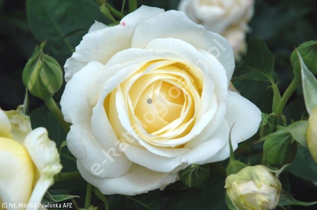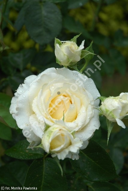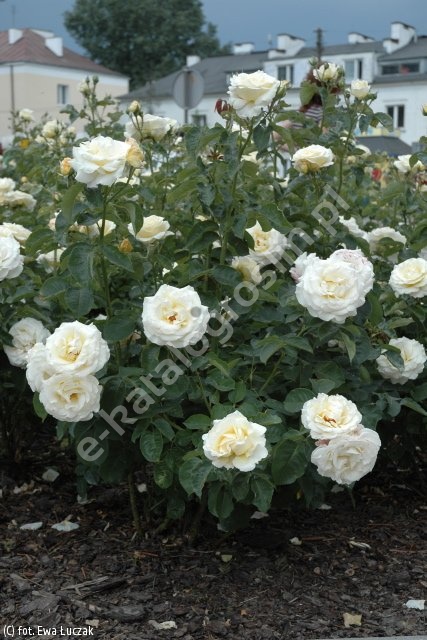 Polska odmiana z grupy róż wielkokwiatowych, wyhodowana przez Stanisława Żyłę w 1980 r. Rośnie bardzo silnie, tworzy liczne proste, sztywne i grube pędy pokryte średniej wielkości kolcami oraz zwieńczone efektowymi, pojedynczymi kwiatami. Osiąga do 1,5 m wysokości. Liście pięciolistkowe, bardzo duże, jasnozielone, skórzaste, matowe. Ulistnienie bardzo gęste, zdrowe i trwałe, utrzymuje się najdłużej spośród uprawianych w kraju róż. Pąki kwiatowe szerokostożkowate, długości około 5 cm. Kwiaty białokremowe, duże, średnicy 12-13 cm w pełnym rozkwicie, zbudowane z około 40 lekko pachnących płatków. Zakwita w połowie czerwca, powtarza kwitnienie w drugiej połowie lata, tworząc pąki kwiatowe aż do późnej jesieni. Najlepiej rośnie na glebach żyznych, piaszczysto-gliniastych, umiarkowanie wilgotnych, przepuszczalnych. Wymaga pełnego nasłonecznienia. Podlewanie krzewów w okresie suszy sprzyja obfitemu i długotrwałemu kwitnieniu. Wartościowa odmiana odporna na czarną plamistość. Przenawożone azotem krzewy są podatne na mączniaka prawdziwego. Przy mokrej i chłodnej pogodzie, zwłaszcza jesienią, kwiaty w pąkach bywają porażane przez szarą pleść i się nie rozwijają, co jest jedną z nielicznych wad rośliny. Krzewy zabezpieczone na zimę kopczykiem ziemi nie przemarzają nawet podczas surowych zim. Wiosną kopczyki należy usunąć, a pędy przyciąć na wysokości około 10-15 cm od ziemi. Wartościowa odmiana polecana do sadzenia w gruncie w ogrodach przydomowych i parkach, na rabatach, kwietnikach, klombach. Doskonale prezentuje się sadzona w większych grupach jednorodnych oraz w kompozycjach z bylinami.