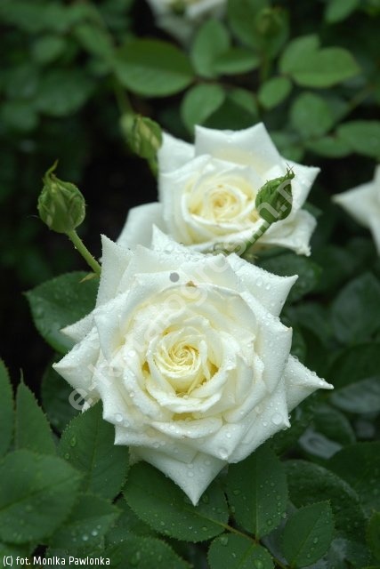 Kwiaty czystobiałe, pełne, duże, 9-10 cm. Ładny, długi pąk. Liście duże, niezbyt gęste, ciemnozielone, lekko błyszczące. Pędy proste. Bardzo silny wzrost, wys. 80-100 cm /140 cm/. Odmiana zdrowa, odporna na przemarzanie. Toleruje intensywne cięcie, daje dużo kwiatów średniej długości. Gęstość sadzenia: 4-5 szt/m2.