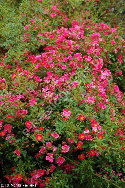 Niewielka róża parkowa i okrywowa ceniona za długie, bardzo obfite kwitnienie oraz podwyższoną odporność na niesprzyjające warunki uprawy. Nazwa odmianowa po przetłumaczeniu odnosi się do bajkowej postaci - Calineczki. Krzewy tworzą jasnoczerwone kwiaty o różowiejących w miarę rozwoju płatkach. Kwiaty są pojedyncze, małe, o średnicy do 3 cm, zebrane w bardzo duże, silnie rozbudowane kwiatostany liczące po 20-30 kwiatów, prawie nie pachnące. Krzewy kwitną bardzo obficie, w drugiej połowie czerwca są prawie w całości pokryte kwiatami. Później kwitnienie jest słabsze, ale powtarza się do późnej jesieni. Bardzo kolczaste, zielone pędy są sztywne, proste, wzniesione, lekko pochylone na boki. Liście jasnozielone, małe, lekko błyszczące, gęsto pokrywające pędy. Krzewy bardzo gęste, rozłożyste, pokrywające szczelnie powierzchnię terenu, osiągają wysokość okołó 50 cm przy szerokości około 70 cm. Odmiana o niewielkich wymaganiach uprawowych. Krzewy na zimę powinny być ściółkowane grubszą warstwą kory. Odmiana tolerancyjna na choroby grzybowe, chociaż w wilgotne lata często porażane przez czarną plamistość. Wiosną cięcie nie jest konieczne, co 3-4 lata warto skrócić pędy i odmłodzić krzewy. Po kwitnieniu nie przycina się kwiatostanów, płatki osypują się same nie szpecąc krzewów, a nowe kwiaty pojawiają się szybko. Krzewy tolerują częściowe zacienienie, okresy niedoboru wody, słabsze gleby. Odmiana o uniwersalnych możliwościach zastosowania. Krzewy sadzi się jako okrywowe w zieleni miejskiej, w pasach przyulicznych, na miejskich rabatach, także pod drzewami o świetlistych koronach, a ponadto w parkach, ogrodach przydomowych, w jednolitych kompozycjach lub wraz rozmaitymi gatunkami roślin: jednorocznych, bylin, traw, krzewów liściastych i iglastych, w ogrodach skalnych, na podwyższonych rabatach, murkach, przy schodach i w pojemnikach. Atrakcyjne są formy okulizowane na pniu. Przeciętna gęstość sadzenia 7-8 sztuk na m2.