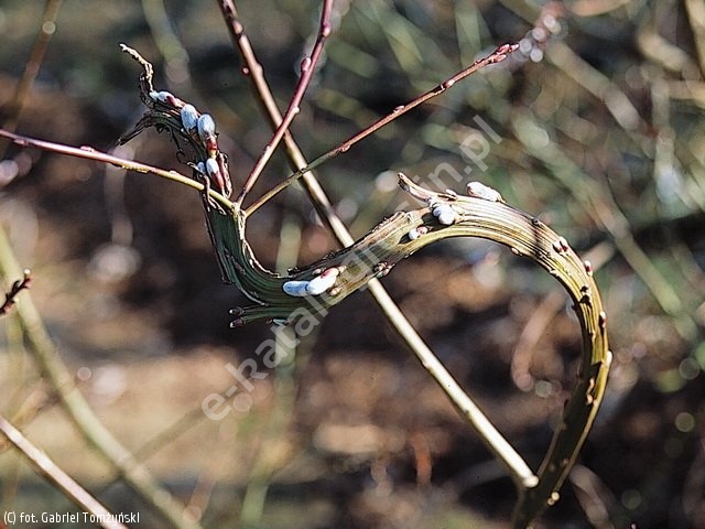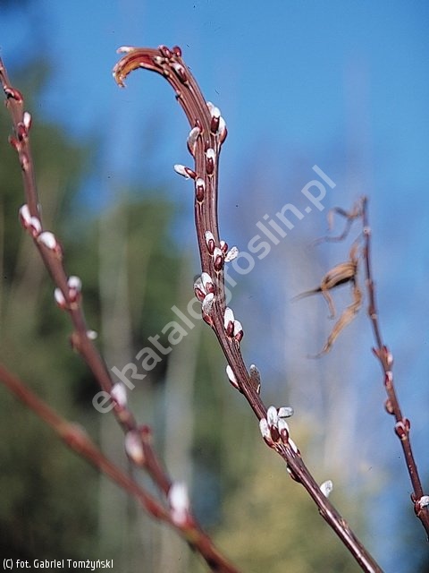 Zaokrąglony krzew o śr. 3 m. Pędy niezwykłe, czerwonawe, niesymetrycznie rozgałęzione, taśmowato spłaszczone i skręcone na końcach, szczególnie dekoracyjne zimą. Wiosną, przed rozwojem liści, na pędach pojawiają się srebrzystobiałe, później żółte, kotki, IV. Liście duże, lancetowate, zielone, do 15 cm dł. Nie toleruje suszy, gleb wapiennych i zasolonych. Często cięta lepiej uwydatnia dziwaczne pędy.