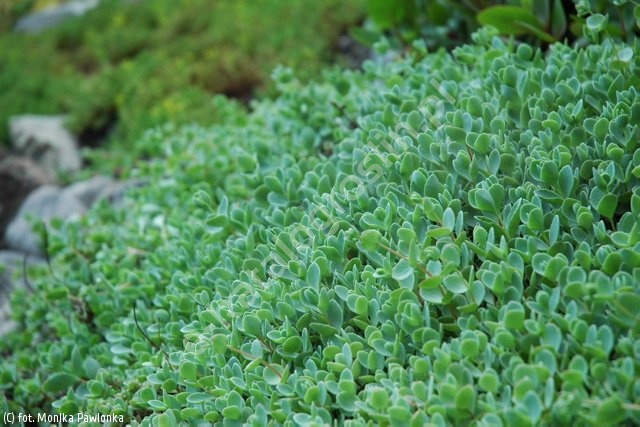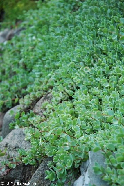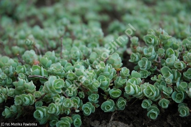Bylina o płożących się, czerwonobrązowych pędach, wysokości 15-20 cm. Pędy gęsto pokryte okrągłymi, niebieskawymi liśćmi z wąskim, czerwonawobrązowym brzegiem. Kwiaty drobne, różowe zebrane w gęste kwiatostany, w VIII-IX. W czasie kwitnienia zaczynają opadać liście. Po kwitnieniu najlepiej ściąć części nadziemne. Do sadzenia na murkach lub wśród większych kamieni, gdzie kwitnące pędy mogą się swobodnie przewieszać. Stosowany w ogrodach skalnych pojedynczo lub 2-3 w grupie. Liczba roślin na 1 m2 - 9.
