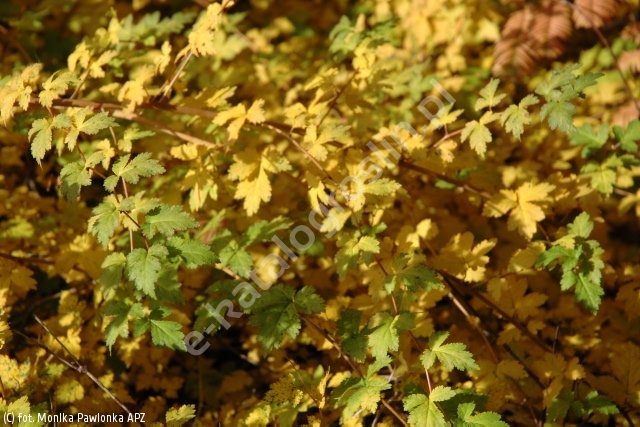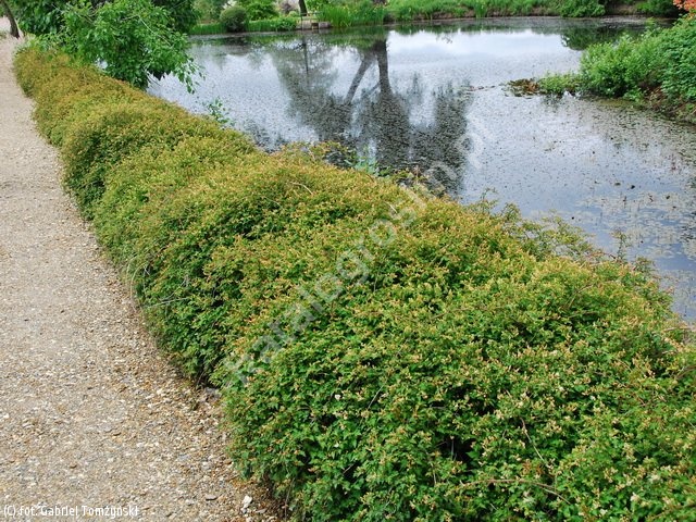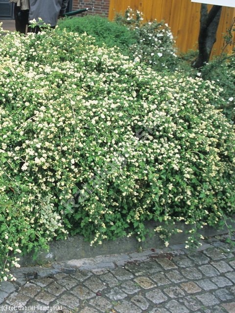 Karłowy krzew z rozpostartymi, ścielącymi się po ziemi pędami. Osiąga 0,5-m wys. i 1,5 m szer. Liście jasnozielone. Jesienią przebarwiają się na żółto lub pomarańczowo. Kwiaty zielono-białe, w gronach, delikatnie pachnące, VI-VII. Stanowisko słoneczne do cienistego. Preferuje wilgotne, ale przepuszczalne i zasobne gleby. Cenna roślina okrywowa.