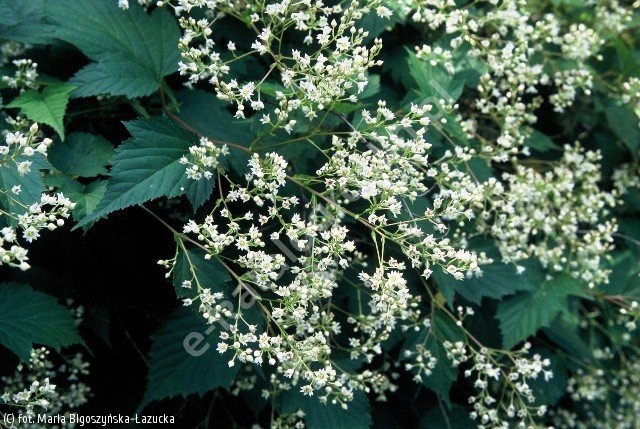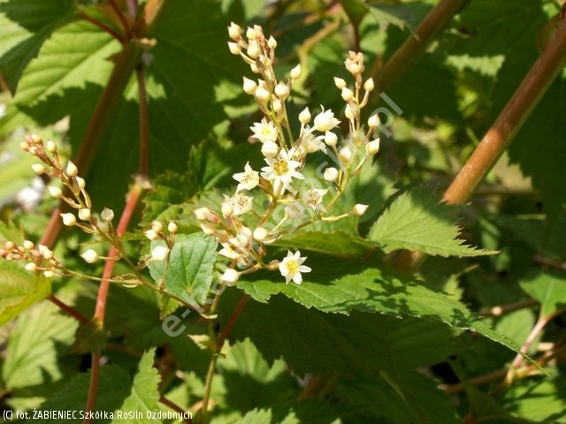 Pochodzący z Japonii szerokorozgałęziony krzew do 1,5-2 m wys. Pokrój regularny. Pędy pomarańczowobrązowe, łukowato przewieszające się do ziemi, ozdobne w stanie bezlistnym. Liście trójklapowane, mocno ząbkowane, szorstkie, 8-10 cm dł., przebarwiające się na czerwono lub pomarańczowo jesienią. Kwiaty białe, drobne, w luźnych wiechach na końcach gałązek, do 10 cm dł., mało dekoracyjne, VI-VII. Roślina bardzo tolerancyjna, ale wrażliwa na suszę. Najlepiej rośnie na glebie przepuszczalnej i wilgotnej, na stanowisku słonecznym, osłoniętym. Może przemarzać w silniejsze zimy, ale doskonale się regeneruje. Dobrze znosi przycinanie. Nadaje się do dużych ogrodów i zieleni publicznej.
