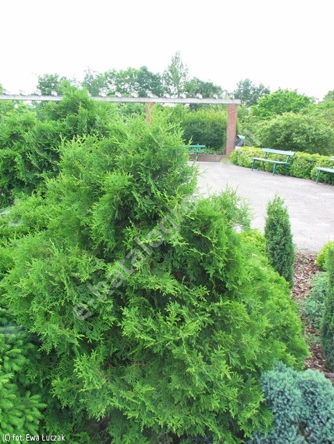 Stara odmiana o nieznanym pochodzeniu, wprowadzona do handlu w końcu XIX wieku, atrakcyjna ze względu na nieregularny pokrój. Karłowa, płaskokulista odmiana, w starszym wieku o nieregularnym pokroju. Tempo wzrostu wolne. Po 10 latach uprawy krzew osiąga 0,4 m wysokości i 0,6 m szerokości. Pędy cienkie, odstające, lekko kędzierzawe. Gałązki częściowo ułożone horyzontalnie, częściowo stojące, mniej lub bardziej faliste, bardzo płaskie, krótkie, szerokie, z gruczołkami po obu stronach. Ulistnienie łuskowate, ciemnozielone. Krzew odporny na mróz. Wymaga gleb żyznych, umiarkowanie wilgotnych, przepuszczalnych oraz stanowisk słonecznych. Krzew polecany do uprawy w niewielkich ogrodach przydomowych, w ogrodach japońskich, na skalniakach, wrzosowiskach i do tworzenia kompozycji z innymi wolno rosnącymi krzewami iglastymi.