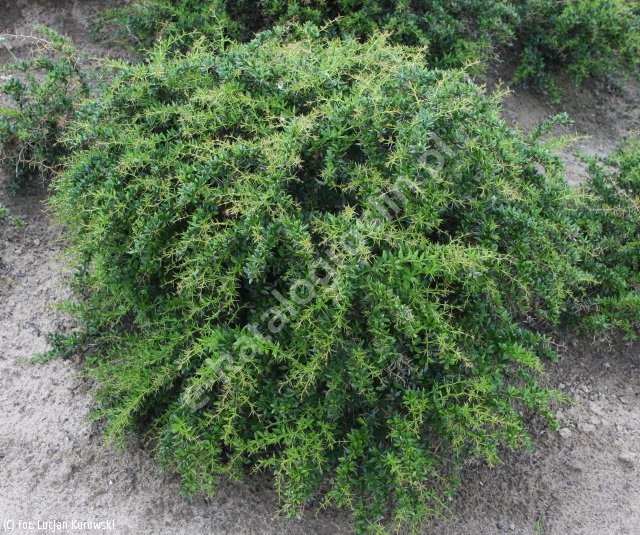 Zimozielony krzew o rozłożystym pokroju. Osiąga wys. 1-1,5 m. Liście ciemnozielone, błyszczące, od spodu szarobiałe. Na pędach ostre ciernie. Kwiaty drobne, żółte, osadzone pojedynczo lub po 2-3, pojawiają się w V, VI. Gleba przeciętna, niezbyt sucha. Krzew wrażliwy na mrozy, lepiej zimuje w ocienieniu oraz miejscach osłoniętych przed wysuszającymi wiatrami. Wymaga okrycia.