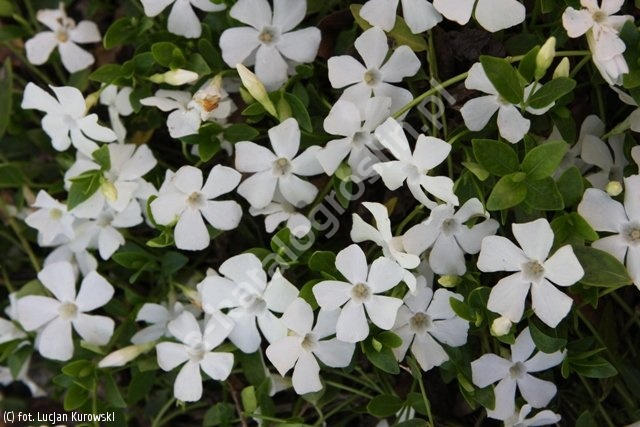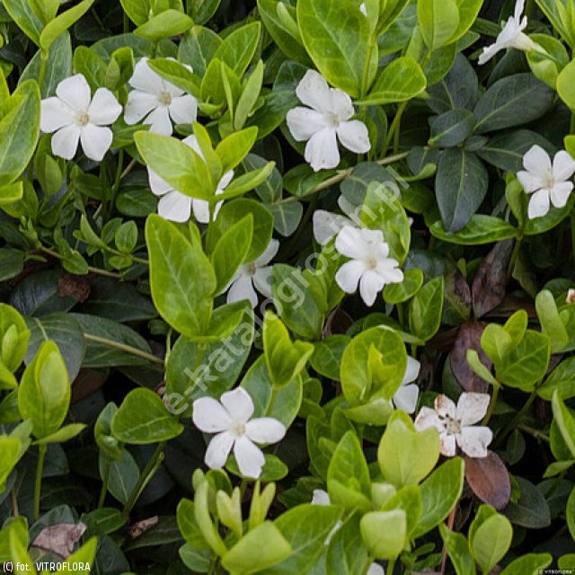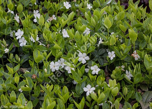 Niewielka, zimozielona krzewinka o ścielących się po ziemi pędach i białych kwiatach, znana w uprawie od końca XVIII wieku. Roślina wypiętrza się do 20-30 cm wysokości i rozrasta na ponad 1 m szerokości. Tworzy długie, wiotkie pędy płonne osiągające 0,5 metra długości, pełzają po powierzchni gruntu i łatwo się zakorzeniają oraz krótkie, 10-15 cm pędy kwiatowe, wyrastające wiosną z miejsc, w których zakorzeniły się pędy płonne. Liście eliptyczne, skórzaste, ciemnozielone z wydatnym unerwieniem. Blaszki liściowe mają 2-4 cm długości, z wierzchu są błyszczące, od spodu matowe. Białe kwiaty wyrastają pojedynczo z pachwin liści, są osadzone na długich szypułkach, składają się z pięciu skośnie uciętych, łopatkowatych płatków zrośniętych u nasady, przypominają miniaturowe wiatraczki o średnicy 2-3 cm. W pąku płatki zachodzą na siebie lewostronnie. Rośliny kwitną obficie na wiosnę, później tworzą pojedyncze kwiaty przez cały sezon. Barwinek dobrze rośnie na większości gleb ogrodowych, poza skrajnie suchymi i wilgotnymi, znosi niedobór wody. Preferuje miejsca półcieniste i cieniste. Sadzony na stanowiskach słonecznych może lekko przemarzać w mroźne, bezśnieżne zimy, ale ścięty na wiosnę z łatwością się regeneruje i szybko odrasta. Nadaje się do zadarniania gleby pod koronami drzew, do obsadzania skarp, nasypów, brzegów ścieżek. Nadaje się do sadzenia w każdym cienistym zakątku ogrodu.