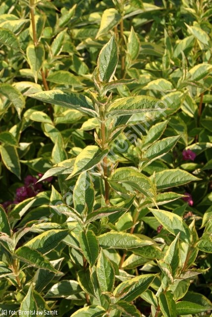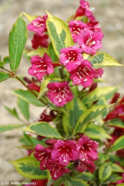 Wyprostowany krzew, bujnie rosnący, o zewnętrznych pędach obwisających. Osiąga ok. 2,5 m wys. Liście podłużne, ostro zakończone z żółtym obrzeżeniem. Kwiaty dzwonkowate, ciemnoróżowe, VI-VII. Preferuje gleby żyzne, umiarkowanie wilgotne. Do sadzenia pojedynczo lub w grupach, w kontrastowych zestawień kolorystycznych.