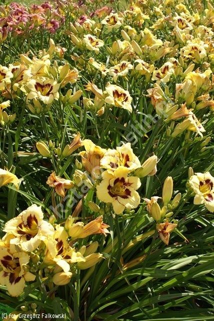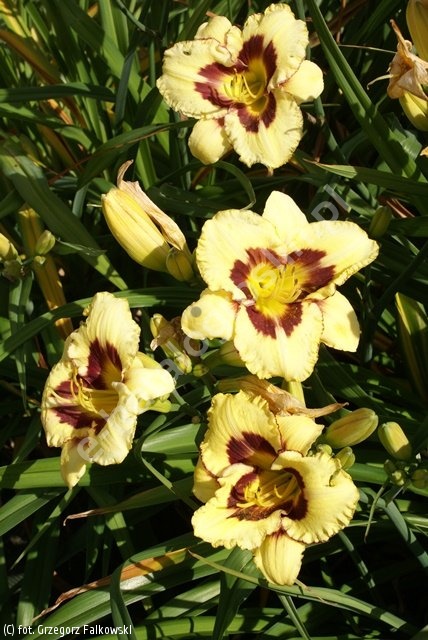 Niezwykle atrakcyjna, amerykańska odmiana liliowca o dwubarwnych kwiatach, autorstwa jednego z najbardziej znanych hodowców liliowców - Pata Stamile’a z USA. Bylina średnich rozmiarów, dorastająca do 70 cm wysokości. Liście jasnozielone, łukowato wygięte, tworzące kępy. Pędy kwiatostanowe wyniesione ponad liście, zakończone na szczycie licznymi pąkami kwiatowymi. Kwiaty duże, szerokolejkowate o aksamitnych, kremowobiałych płatach. Trzy górne płatki są wyraźnie szersze od dolnych, obwiedzione na brzegu śliwkową obwódką. Centrum kwiatu wypełnia duże, śliwkowe, purpurowe oko przechodzące w głąb w żółć i dalej w zielonkawą gardziel. Pylniki żółte. Uroda tej odmiany w pełni kwitnienia jest niesamowita. W dobrych warunkach glebowych rośliny kwitną obficie, VII-VIII. Odmiana mrozoodporna, łatwa w uprawie, nadaje się do sadzenia w całym kraju. Wymaga stanowisk słonecznych lub lekko ocienionych, gleb żyznych i umiarkowanie wilgotnych. Polecana do uprawy na rabatach bylinowych mieszanych i jednogatunkowych, w ogrodach przydomowych i w miejscach reprezentacyjnych w zieleni miejskiej.
