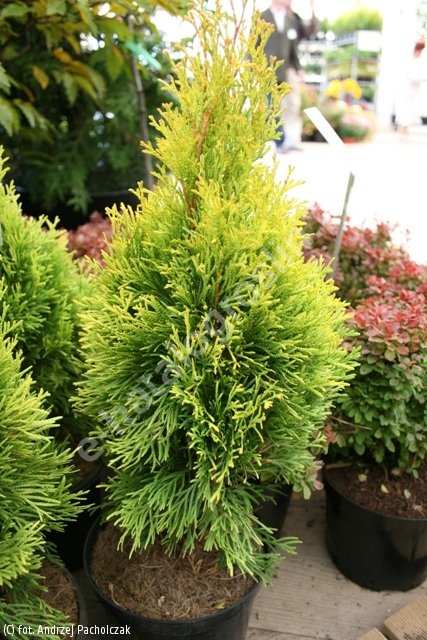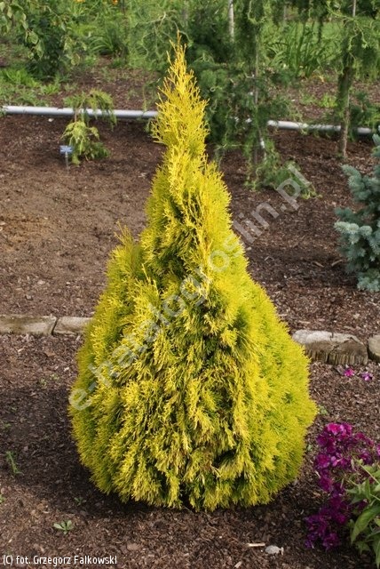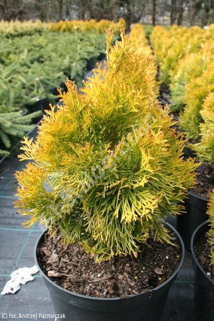 Nowa odmiana wyselekcjonowana w Holandii z popularnej odmiany 'Smaragd'. Wolnorosnący krzew o szerokostożkowym pokroju, dekoracyjny ze względu na jaskrawożółte zabarwienie igieł. Dorasta do 3 m wysokości. Tolerancyjny co do gleby, choć najlepiej rośnie na glebach żyznych. Stanowisko słoneczne. Odmiana szczególnie polecana do małych ogrodów ze względu na powolny wzrost. Nadaje się również do sadzenia w pojemnikach.