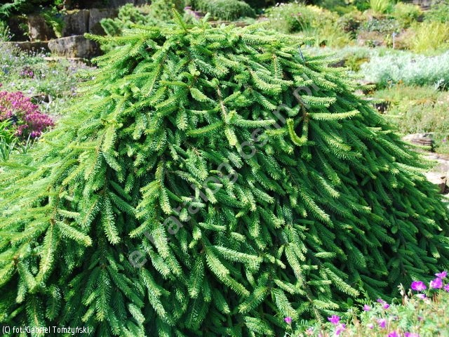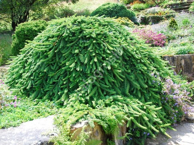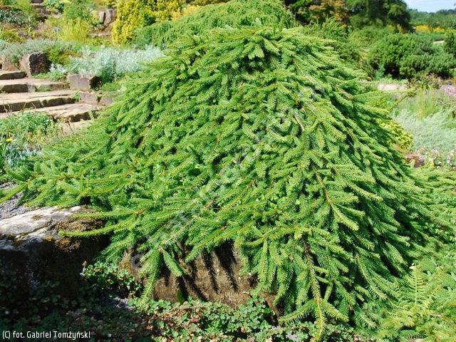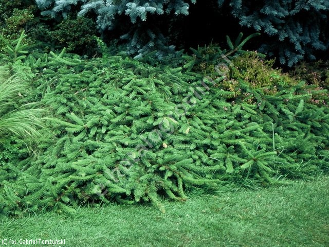 Bardzo oryginalna, stara odmiana świerka pospolitego, prawdopodobnie francuskiego pochodzenia, o gęstym, płaczącym pokroju. Jej cechą charakterystyczną jest brak przewodnika a liczne pędy równomiernie, kaskadowo opadają i płożą się po ziemi. Pędy pokryte są jasnozielonymi igłami oraz dużymi pąkami. Krzewy w wieku dziesięciu lat uzyskują około 0,3 m wysokości i 1,2 m szerokości. Stanowisko do uprawy powinno być słoneczne lub tylko lekko ocienione. Odmiana ma przeciętne wymagania glebowe i wilgotnościowe. Doskonała roślina do ogrodów skalnych i alpinariów.
